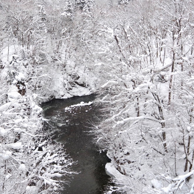 A deep pool near Nishiki Bridge over the Toyohira River, which flows through the Jozankei spa resort. In autumn, the trees overhanging both banks of the river turn beautifully red and reflect their colours on the tranquil surface of the water. This is a spot where you can enjoy a breathtakingly colourful and spectacular view. (16-minute walk from the inn).